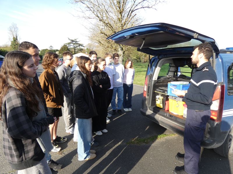 Rien de grave, il s’agit juste d’une très belle rencontre avec un gendarme dans le cadre de la Découverte des métiers ! Le brigadier William, sous-officier à la gendarmerie de Châteauneuf est venu présenter l’organisation générale de la gendarmerie ainsi que son métier au quotidien. Ce métier consiste à 60 % d’enquêtes en bureau, en cherchant des preuves et en essayant de rétablir la vérité concernant des délits plus ou moins graves à la demande d’un procureur. Le reste du temps est passé en patrouille sur le terrain. Le brigadier William a présenté son équipement ainsi que tout le matériel nécessaire stocké dans la voiture de gendarmerie : gilet pare-balles, documents administratifs, tests d’alcoolémie, de prise de stupéfiants, matériel de prise d’empreintes… Des casques de CRS sont aussi présents, (très lourds + de 5kg) au cas où il y aurait un évènement très grave en attendant la venue en hélicoptère des CRS de la région parisienne.